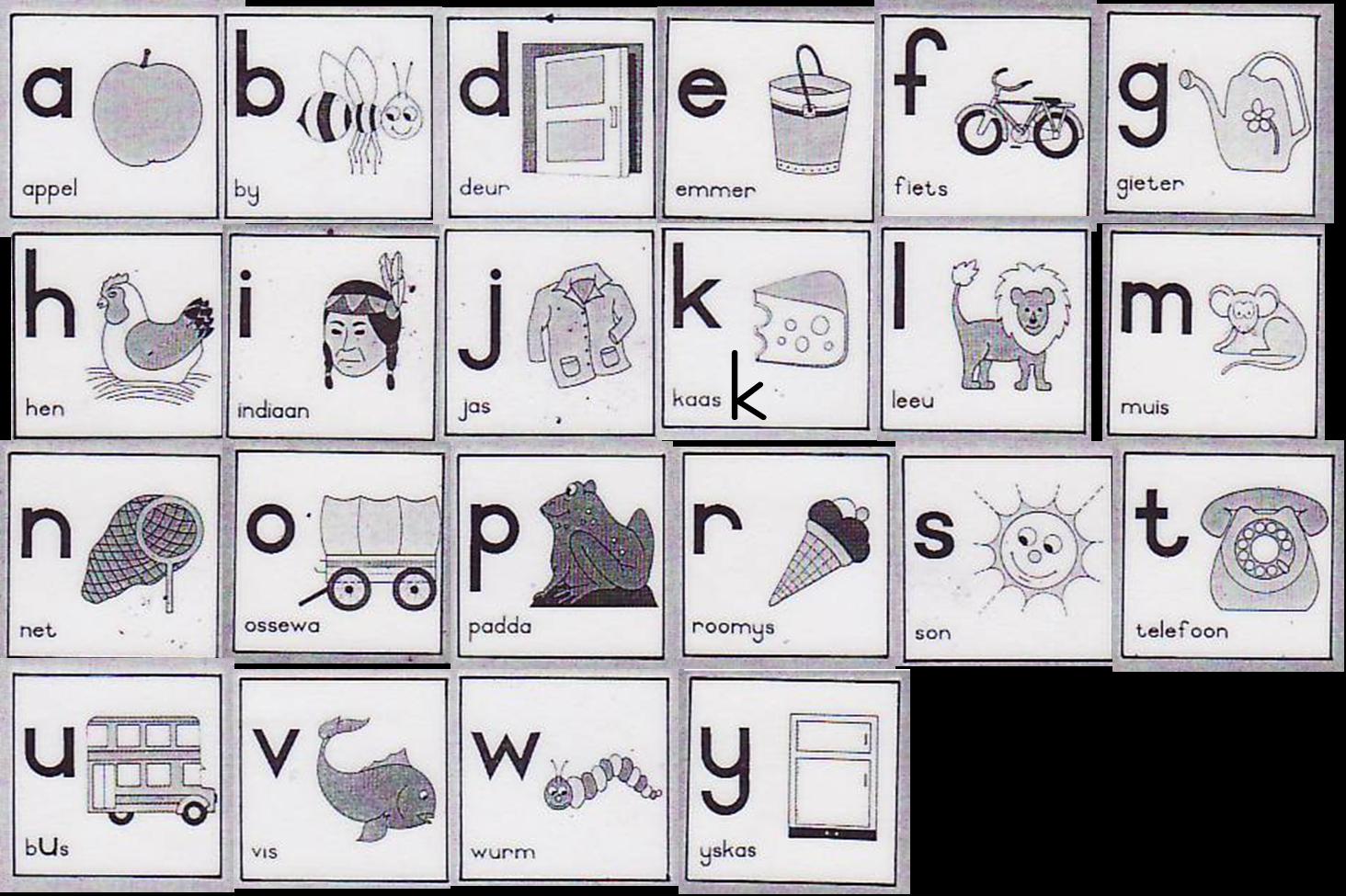 c het “check” blokkies, x het ‘n x-straalplaat, z het ‘n zebra-patroon, a het ‘n appel, b het ‘n bal in die ronding, d het ‘n donkie binne-in, e het ertjies daarin, f het ‘n feë, g is goudkleurig, h is vol hartjies, i het ‘n indiaanmeisie, j het jellieboontjies, k is vol katte, l is vol legkaartstukkies, m het die maan in die boonste rondings, n het ‘n net, o het ‘n otter, p is pienk en pers, r is rooi, s is silwer, t het ‘n tier se oë en oranje en swart strepe, u het ‘n bus, v het vlamme, w het water, y het ‘n ystervarkie en z het ‘n zoeloeseun. Baie sterkte en lekker werk 😉