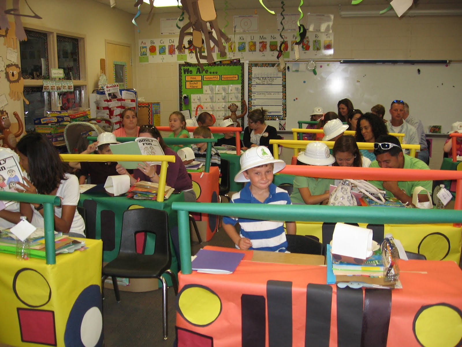 • As julle oor ‘n wildbewaarder praat, kan elkeen ‘n “selfportret”-gesig met ‘n safari-hoed maak.  Maak dan ‘n enorme Jeep en gee vir outjies byvoorbeeld groot blare of ‘n savanna-grasveld om te verf.  Maak dan ‘n muurtoneel met die hele klas op in die Jeep.