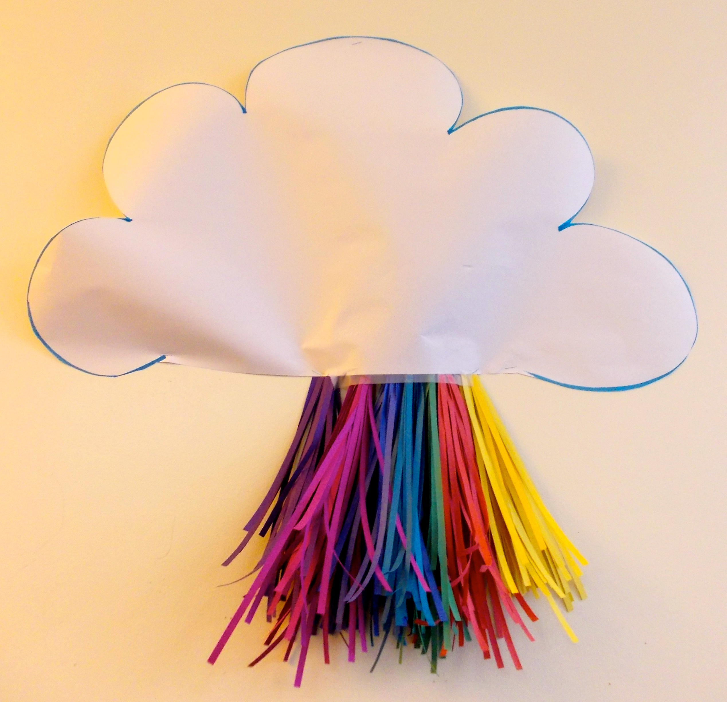 - Sny ‘n enorme wolk uit wit papier. Snipper kleurryke A4-bladsye in ‘n snippermasjien en vra die kleingoed om dit volgens kleure te sorteer. Plak die gegroepeerde kleure op die keersy van die wolk vas en plak die wolk ligweg bokant ‘n venster, luggat of naby ‘n waaier vas. Die reën behoort in die briesie te ritsel.